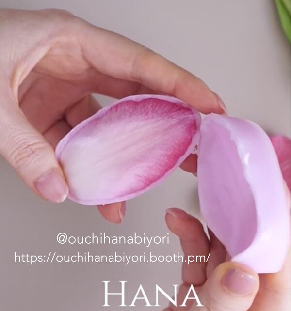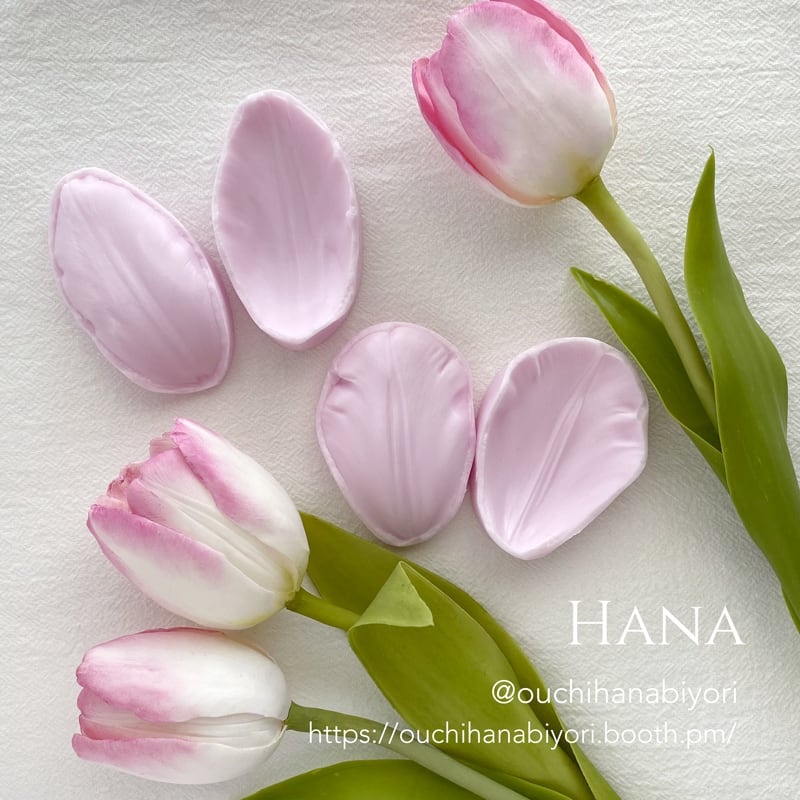 生花のチューリップから型取りした、内花弁・外花弁の表面と裏面の計4パーツがセットになっています。