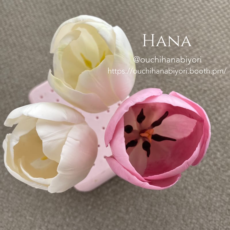 生花のチューリップから型取りした、内花弁・外花弁の表面と裏面の計4パーツがセットになっています。
