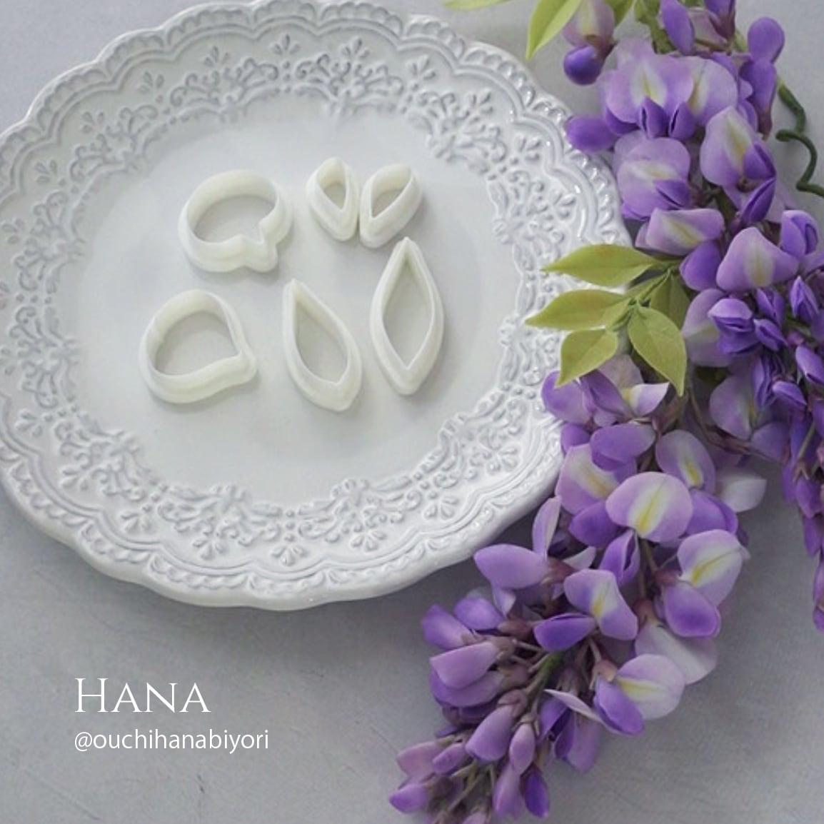 This clay cutter set is designed for making wisteria flowers, buds, and leaves.