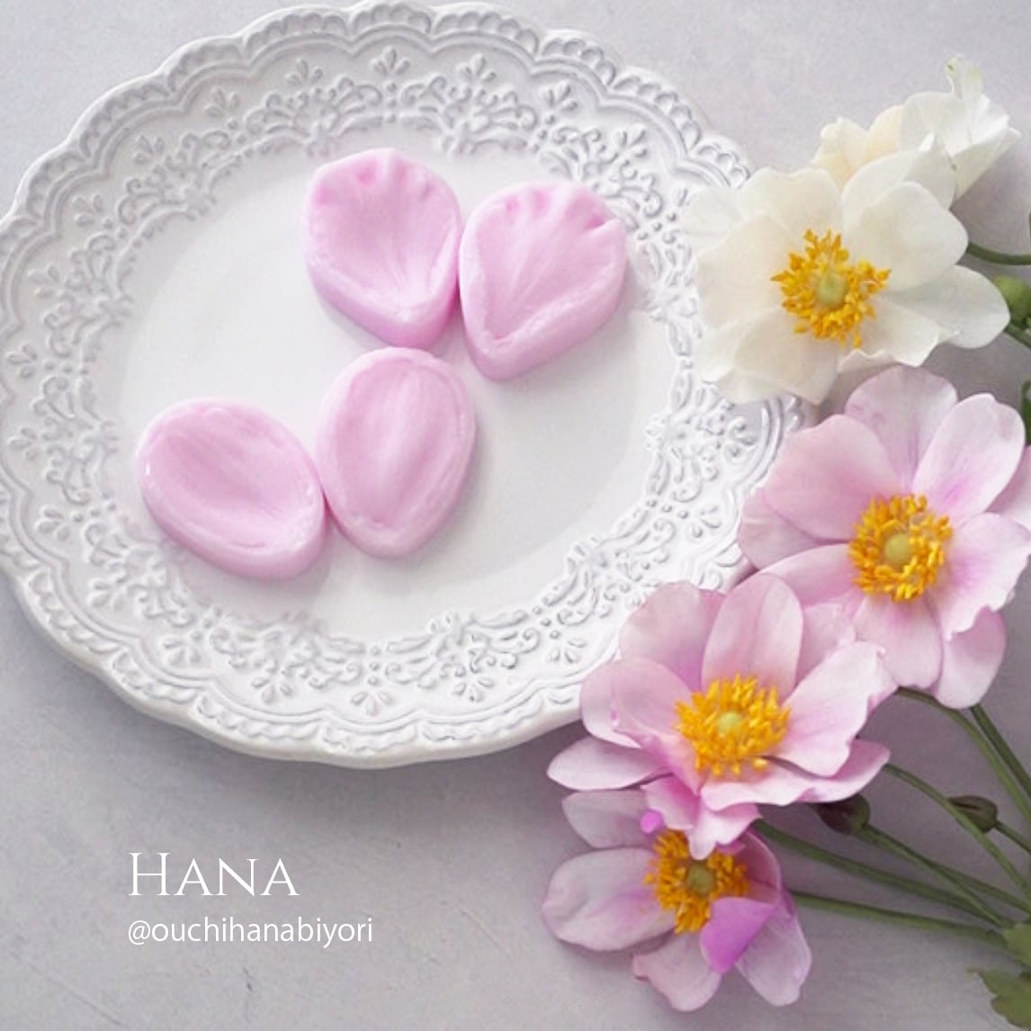 同じ1輪のお花から、形の整った楕円形の花びらと扇形の花弁の2タイプを選んで型取りしています。
