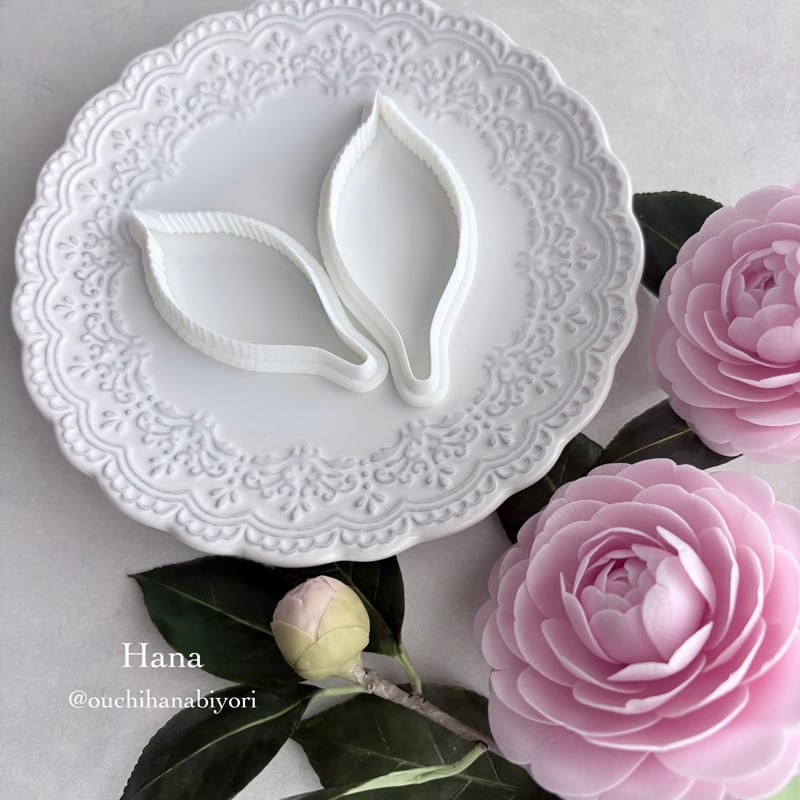 A cutter designed for air-dry clay / cold porcelain, allowing you to cut Otome-tsubaki camellia leaves with a single press.